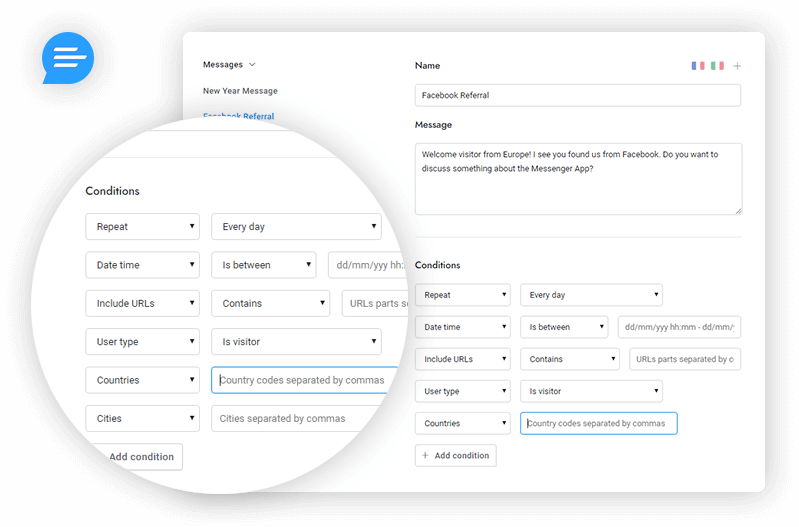 Automations allow you to send messages, show pop-ups, customize the chat design, and more when specific conditions – set by you – are validated. Access more that 13 conditions and 5 automation types.