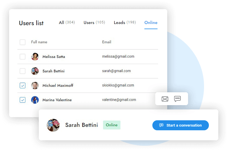 Send direct chat messages, emails, and text messages to your users in real-time. Personalize every message with custom merge fields and automatically send notifications.