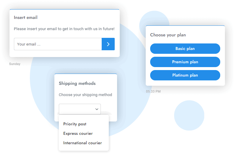 Agents can engage users with more than 10 rich messages and can combine them together. Agents can insert rich messages as strings of parameters directly in messages.