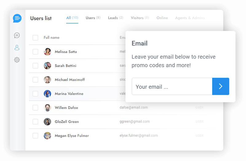 Use live chat to increase your newsletter subscribers. Send messages to requesting user email addresses and setting up future confirmation emails. This feature integrates with major newsletter services.